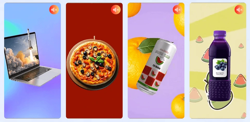 For showcasing multiple products, the catalog feature accepts up to 10 images per video. Each product gets customizable entrance and exit animations—zoom effects, slides, fades, and rotations.