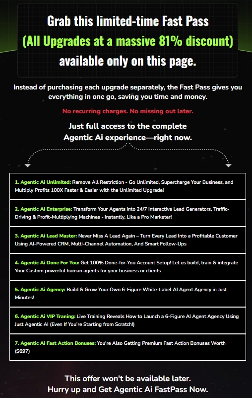 FE Agentic AI Commercial ($47): This is your entry ticket. It gets you the core platform and lets you start creating agents. The price starts at $47 but will rise to $67, so getting in early saves you some cash.