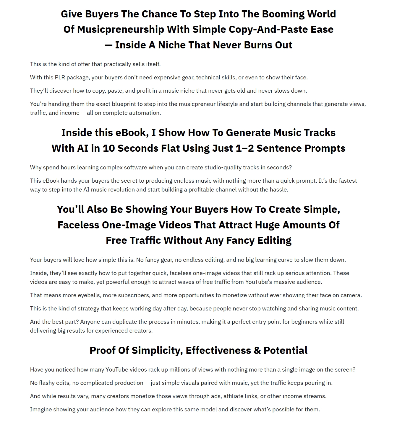 - Bloggers & Website Owners: This PLR package is a content goldmine. Use the licensed text to fuel your content calendar by creating in-depth blog articles, downloadable free checklists, Youtube videos, or even authentic case studies by launching your own AI music channel.