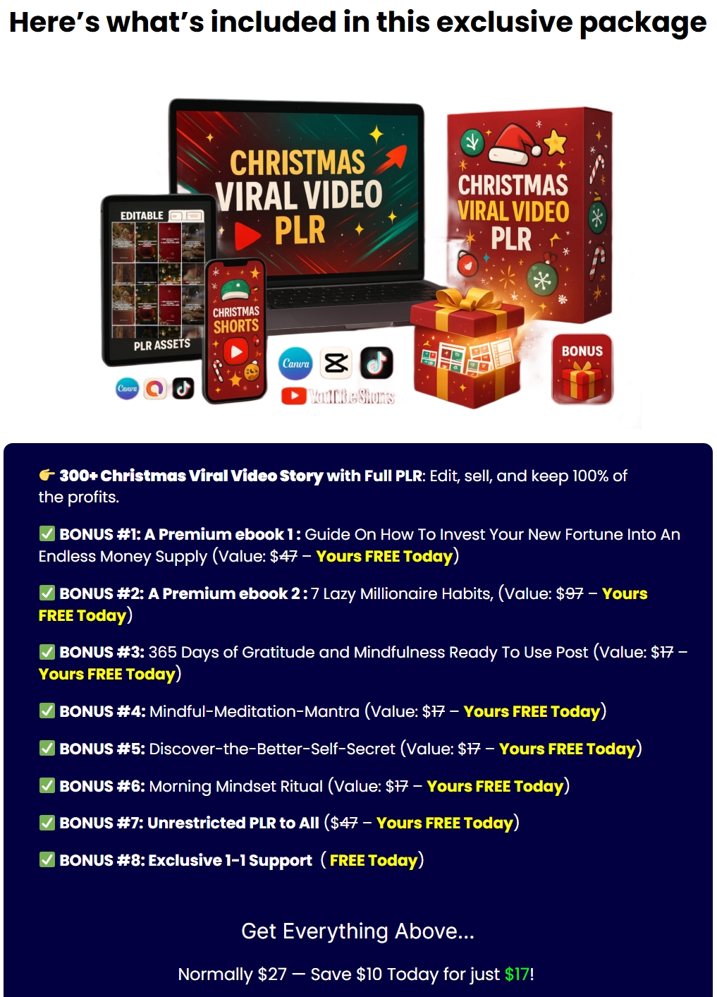 Front-End Price: currently, during the launch, you can grab the whole Christmas Viral Video PLR bundle for around $17.