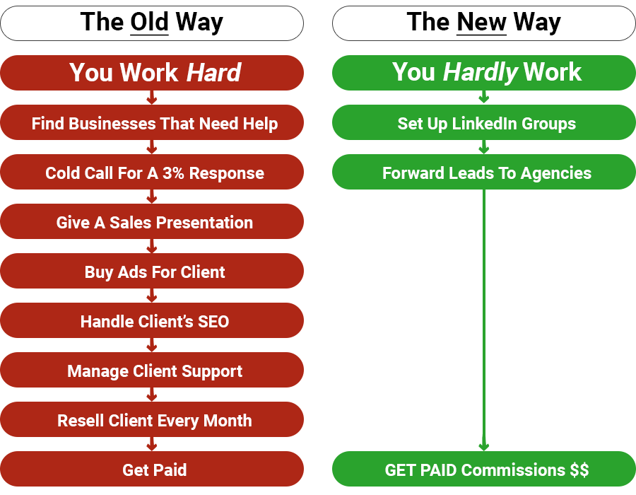 Essentially, Connect N Cash is a coaching course that exposes a secret loophole on LinkedIn. You learn to become a digital matchmaker — using LinkedIn groups to unite local business owners (who need a service like SEO, web design, or ad management) and specialized marketing agencies.