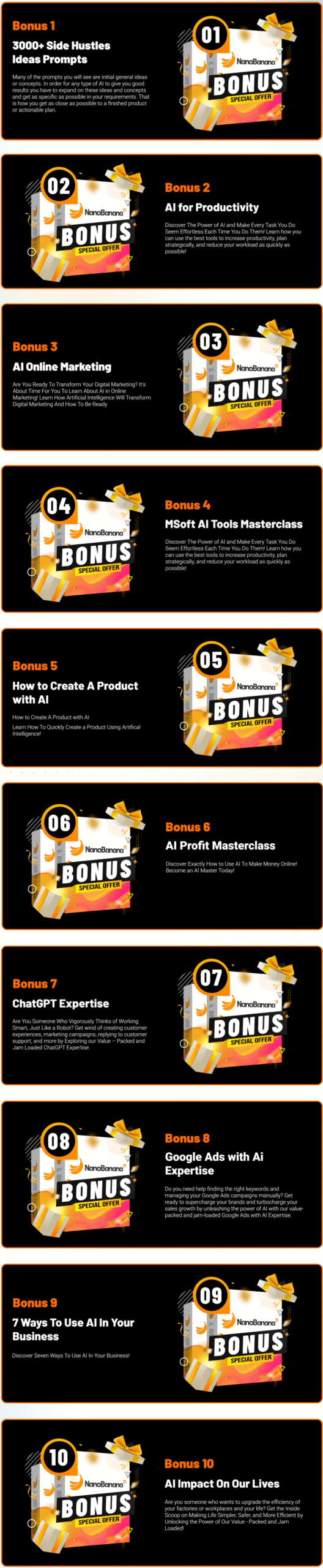 You might also want to explore the exclusive upgrades from NanoBanana AI. Optional One-Time Offers containing some added creative power to get your work done faster and more efficient, and increase the value of your investment. You can even use code “NB30” during checkout and take 30% Off ALL OTOs! Here’s a quick glance at the OTOs, So you can see how you can use each OTO to grow your projects: