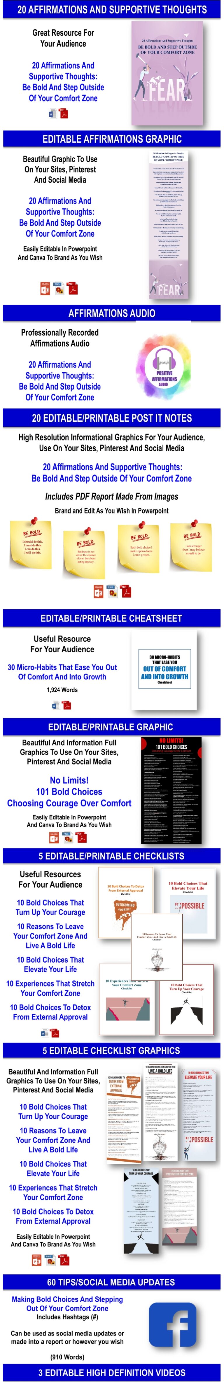 🎯 This is not fluff: you get three comprehensive reports. You get substantial pieces on micro-challenges, preparing for the unknown, and lessons from stepping outside your comfort zone. Each report is perfect for lead magnets or bonus content.