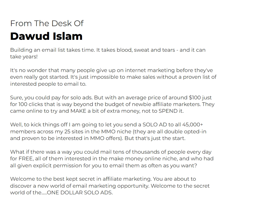 One Dollar Solo Ads comes from Dawud Islam. If you’ve spent any time at all on platforms like WarriorPlus or JVZoo, you’ve probably come across his name. He’s a well-established vendor and affiliate marketer who consistently puts out new products.